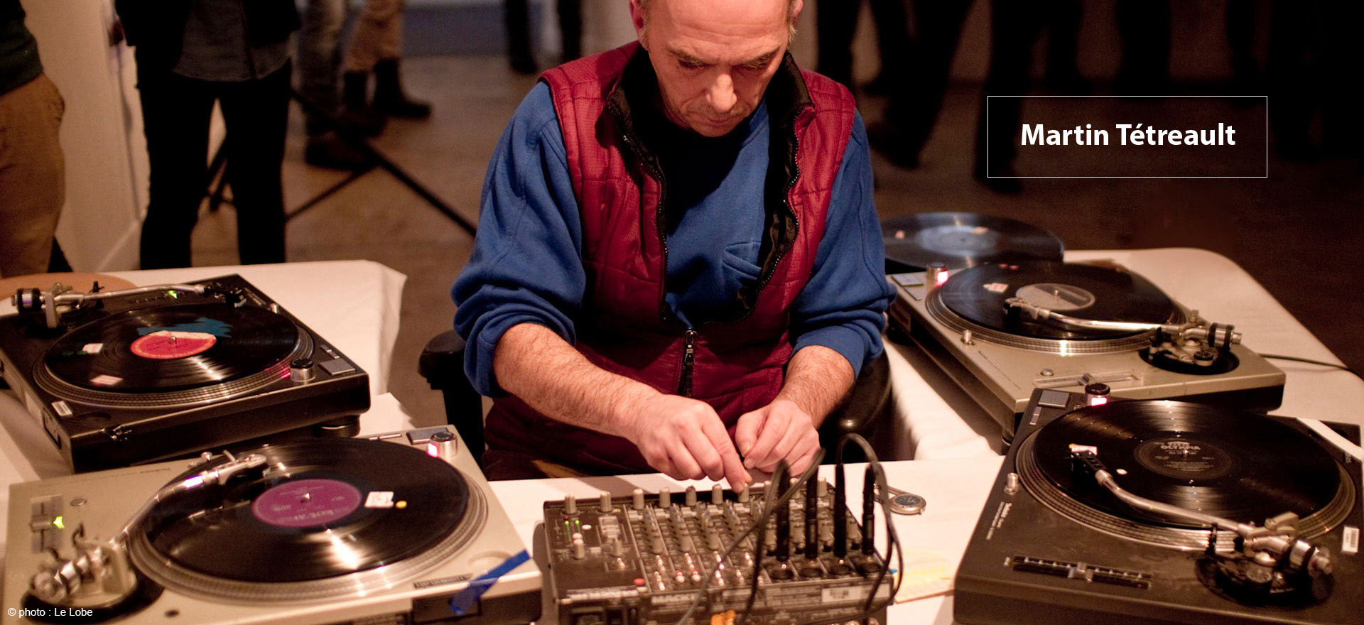 Martin Tétreault, Montréal turntablist of international renown, comes from a visual arts background. He has produced numerous works on compact disc, as well as stage performances, with diverse collaborators: Diane Labrosse, René Lussier, Jean Derome, Michel F Côté, I8U, Otomo Yoshihide, Kevin Drumm, Xavier Charles, Ikue Mori, and several others. Having abandoned the musical citation upon which his work had been built since its beginnings in 1985, he is now exploring the intrinsic qualities of the turntable: motor sounds, parasitic sounds, etc. He also uses needles and prepared surfaces (thank you John Cage) as well as small electronic instruments. This analog noise music approach allows him to finally forgo answering the question, “But what about copyright?”, and to be invited to electronic music events (!). When he wants to take a break from music, he returns to visual arts in order to sand, scrape, and cut up books or magazines…