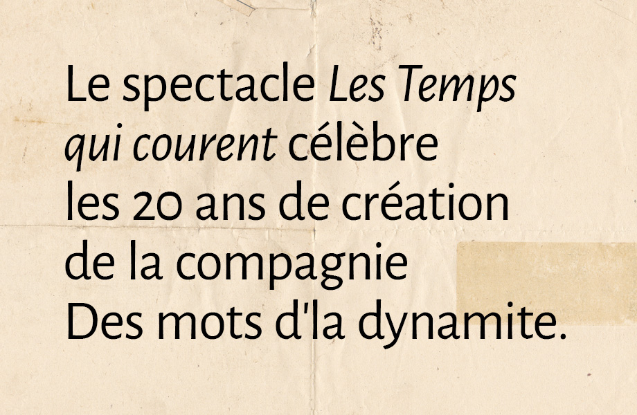 Le livre-disque Les temps qui courent, vingt ans de paroles tenues est publié aux Éditions Planète rebelle. Il est disponible en communiquant avec l’équipe de la compagnie au 514.528.7070 / info@desmotsdladynamite.com